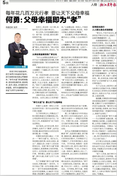 全球川商總會(huì)副會(huì)長(zhǎng)、浙江省四川商會(huì)執(zhí)行會(huì)長(zhǎng)、浙江朗佑控股有限公司董事長(zhǎng)、“孝行大道”理論的發(fā)起者、倡導(dǎo)者和踐行者何勇先生得到了浙江老年報(bào)的專題報(bào)道。