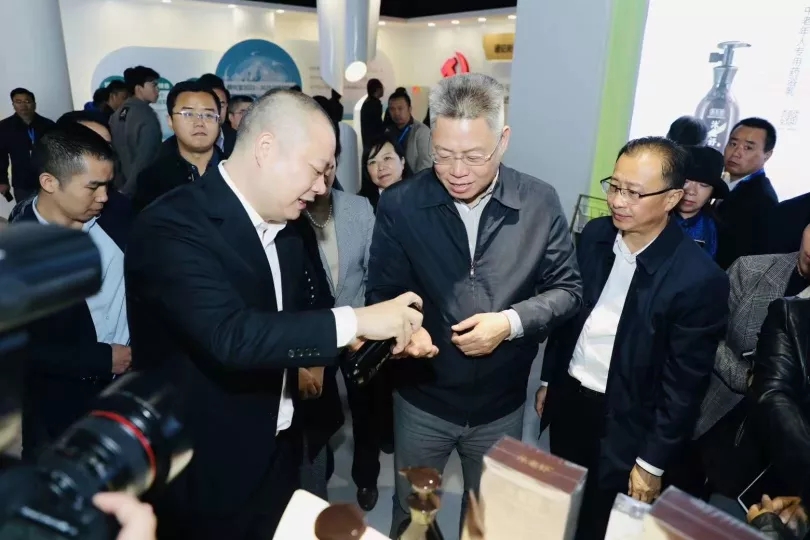 朗佑堂創(chuàng)始人何勇(左)向貴州省副省長王世杰(右)介紹朗佑堂沐耄舒、沐足舒、沐發(fā)舒、沐圣舒、沐童舒等藥浴乳系列產(chǎn)品
