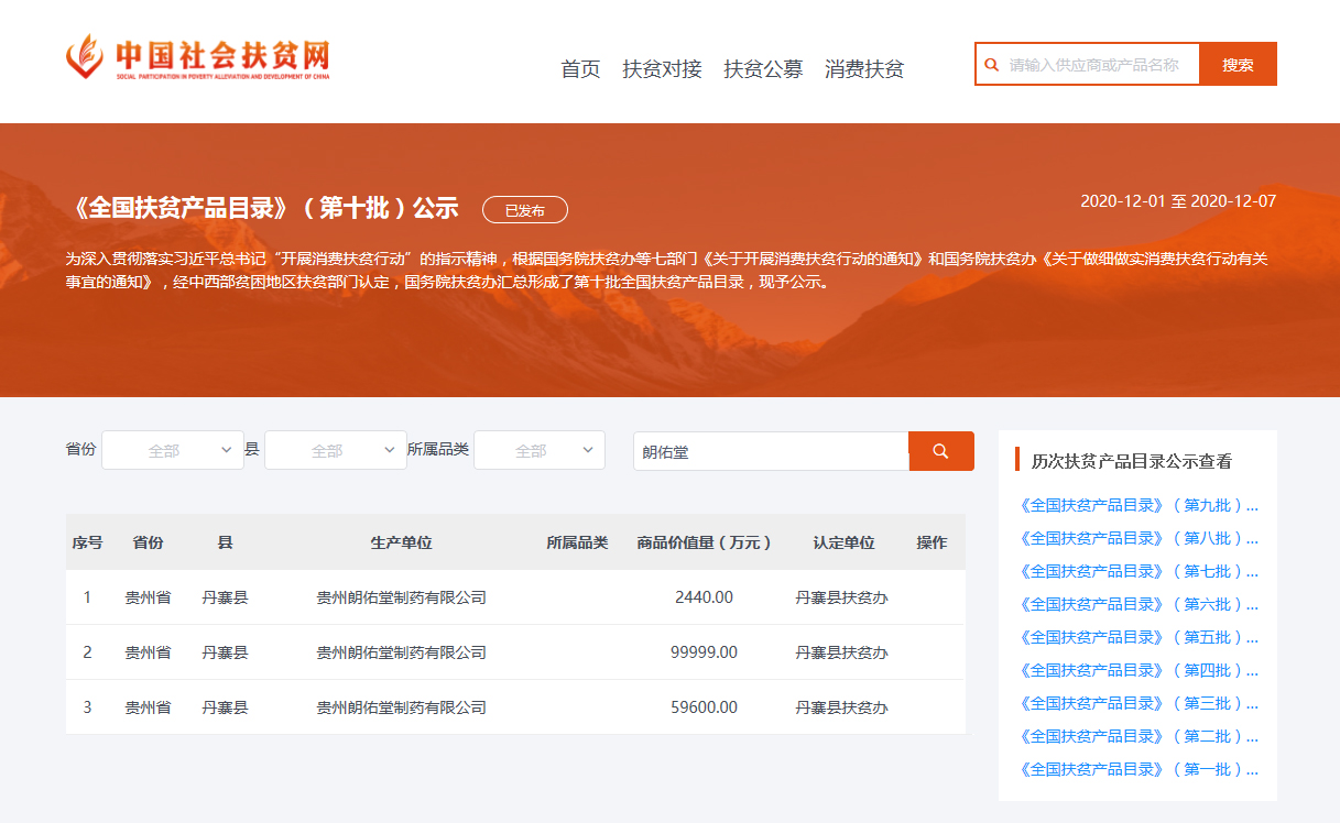 2020年12月11日,朗佑堂藥浴乳,經(jīng)過(guò)縣扶貧辦推薦,省、市扶貧辦,以及國(guó)務(wù)院扶貧辦的層層審核,現(xiàn)已被列入國(guó)務(wù)院《全國(guó)扶貧產(chǎn)品目錄》(第十批)目錄并正式公示。